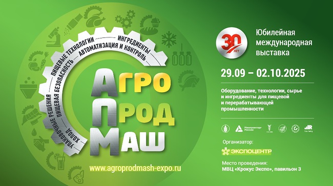 С 29 сентября по 2 октября 2025 года в МВЦ «Крокус Экспо» (павильон 3) состоится 30-я юбилейная международная выставка оборудования, технологий, сырья и ингредиентов для пищевой и перерабатывающей промышленности «Агропродмаш-2025».