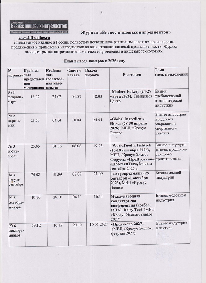 Пресс-релиз журнала "Бизнес пищевых ингредиентов" на 2026 год