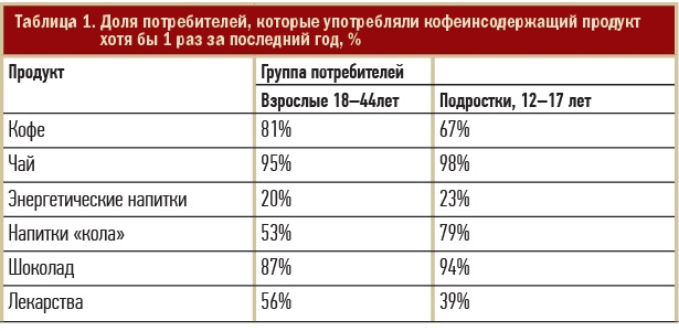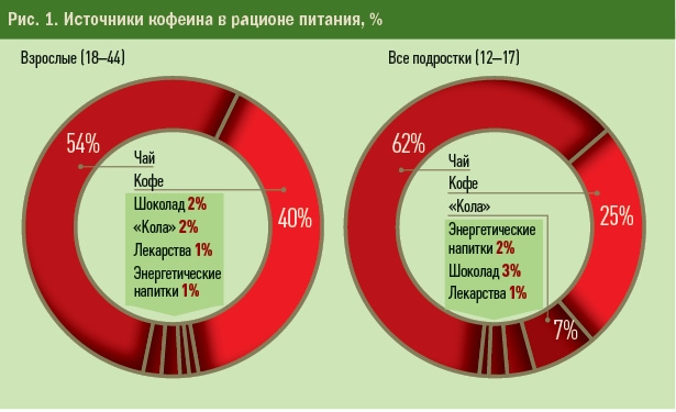 Согласно данным этого же исследования (табл. 1), самым потребляемым кофеинсодержащим продуктом является чай (95% – взрослые, подростки 12–17 лет – 98%), самая низкая доля потребителей (как взрослых, так и подростков) приходится на энергетические напитки (23% – подростки 12–17 лет, 20% – взрослые).