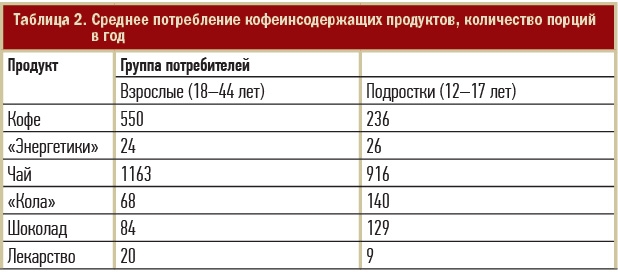 Из таблицы 2 этого же исследования видно, что, например, средний российский подросток (12–17 лет) в год выпивает 916 порций чая, 236 порций кофе, 96 порций напитков типа «кола», 26 порций энергетических напитков (банка 250 мл), потребляет 103 порции шоколада и 9 таблеток кофеинсодержащих лекарств. Также из таблицы видно, что вопреки сложившемуся мнению, средние уровни потребления энергетических напитков (и подростками, и взрослыми потребителями) заметно уступают уровням потребления других кофеинсодержащих продуктов.